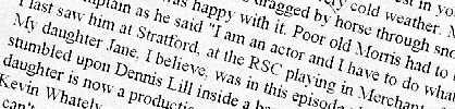 I last saw him at Stratford, at the RSC, playing in [the] Merchant of Venice three years ago. My daughter Jane, I believe, was in this episode playing a dirty nosed little girl who stumbled across Dennis Lill inside a barn as he was fleeing from his hunters. My daughter is now a production runner on the filming of The Brokers Man starring Kevin Whately.