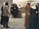 On the small screen, The Roses of Eyam retains many of the elements of its earlier theatrical realisation. Although a small number of leading characters dominate the story, in demonstrating the impact of the plague upon the village, the play requires a large ensemble cast, grouped into families or with specific roles within the community. Taylor chooses a strongly theatrical style of staging and direction, with the company composed on screen in often stage-like ways, and with a preference for long single-take scenes. What reinforces this theatrical ambience still further is that the entire of the drama is staged on a vast studio set — compromising the main village square, the churchyard, the Delph open-air church; as well as all of the interiors in which the fate of Eyam's families is depicted.